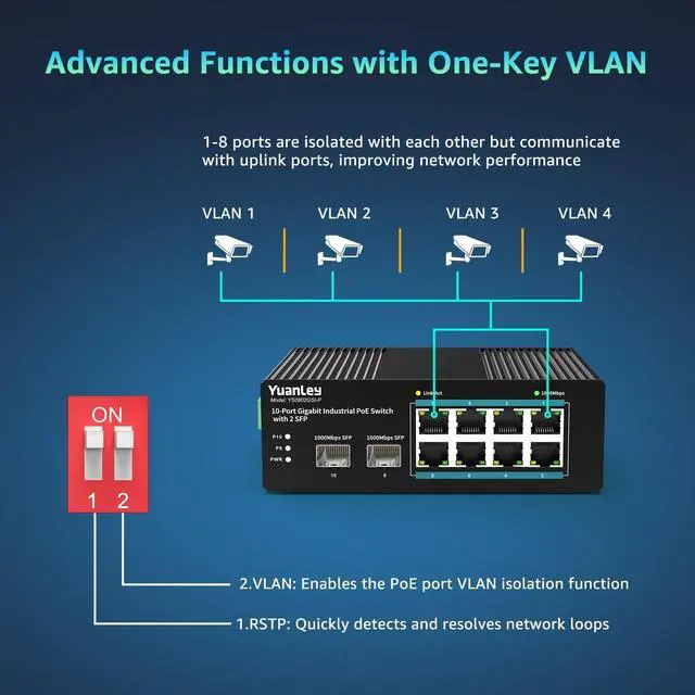 Durable metal housing with a fanless design ensures silent, reliable operation. Equipped with DIN rail mounting for easy installation, it's perfect for harsh industrial environments. ^^ VLAN & RSTPThis 8 port gigabit industrial poe switch supports VLAN for port isolation, improving security and reducing network interference. RSTP ensures quick recovery from network loops, providing a stable and reliable connection. Perfect for industrial applications with high-performance requirements. ^^ Highly Reliable Industrial Grade SwitchesIP40 protection grade, it can work in a wide temperature range from -40C to 80C (-40F to 176F).