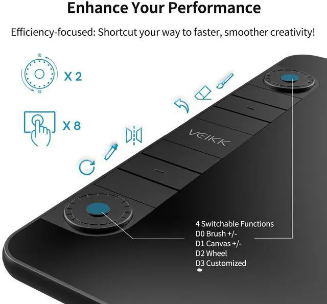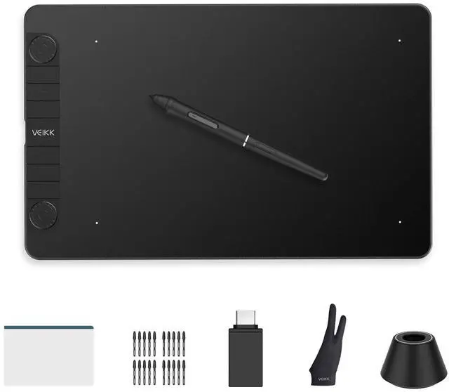 Precision Pen Performance: Unlock exceptional drawing precision with the battery free pen, offering 16384 pressure levels and 60 tilt recognition. Enjoy a natural and responsive drawing experience. The customizable side buttons allow you to assign shortcuts for a smoother workflow ^^ Enhanced Workflow with CustomizationMaximize your efficiency with 6 customizable shortcut keys and 2 Quick Dial on the VK1060PRO drawing tablet, allowing easy access to your favorite tools, brush settings, or zoom controls. Save time with intuitive functions that streamline your creative process, so you can focus on bringing your ideas to life ^^