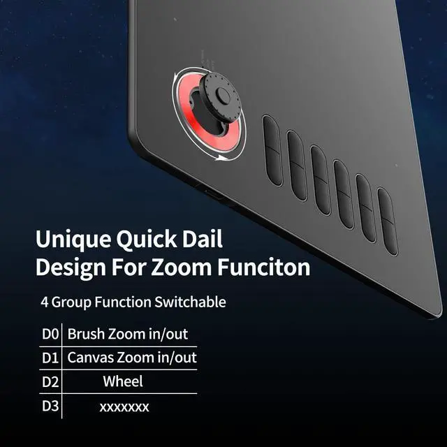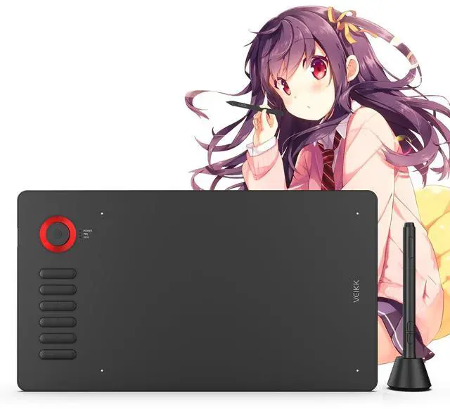 Multi-Function Quick Dial and 12 Customized Express keys The quick dial is specially designed for VEIKK A15Pro drawing tablet. It has default functions for zooming canvas/adjusting brush/scrolling page. You can program the quick dial and all the 12 express keys to functions that you need. Thus, they greatly simplify your workflow, and you would not have to have a keyboard close. ^^ Intelligent Passive PenThe battery-free pen features 8192 levels of pressure sensitivity and 250 PPS report rate, so you can draw lines of different thicknesses according to your needs without any delay.