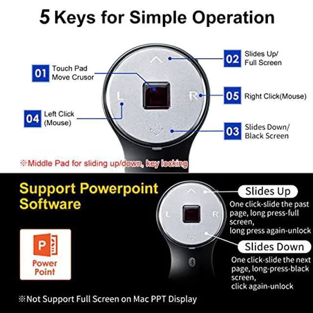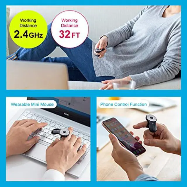 [(FINGER WEARING WITH 5 BUTTONS)] - This lightweight finger mouse features off/on table use for flexible occasions. Design with four buttons and a touchscreen pad, it works as a regular mini mouse and a wireless presentation clicker. Work well to control your desktop PC, laptop, phone, tablet, and screen. Whether in a meeting, watching a film on a bed/sofa, or browsing the pad, you can easily control your electronic devices.