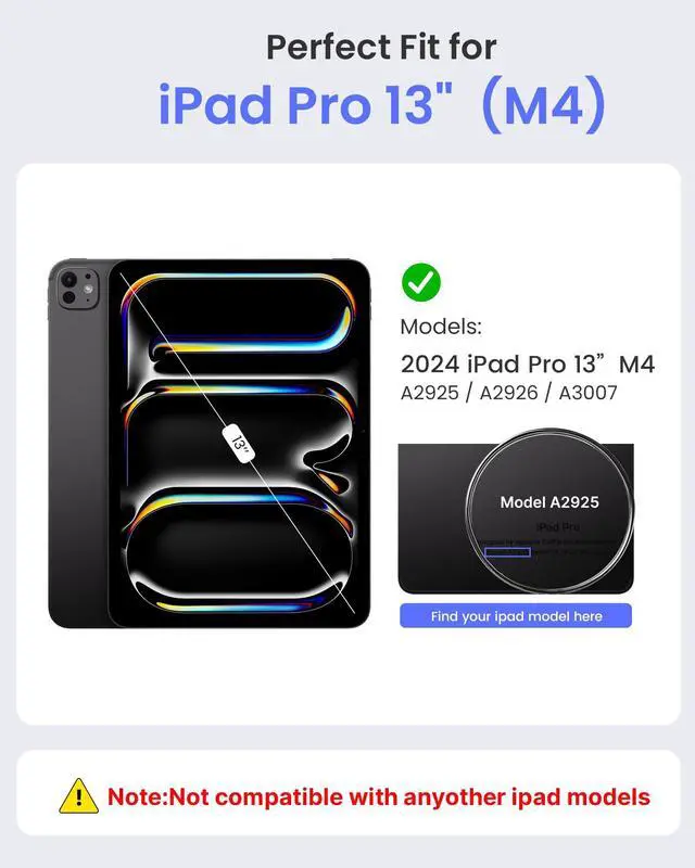 : Exclusively designed for iPad Pro 13-inch M4 (2024), compatible with models A2925, A2926, and A3007. The unique magnetic arrangement ensures compatibility with these models only. If you're unsure about compatibility, feel free to reach out we're happy to assist.