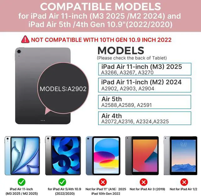 Compatibility - Only compatible with iPad Air 11-inch (M3) 2025, iPad Air 11-inch (M2) 2024, iPad Air 5 (2022, 10.9"), and iPad Air 4 (2020, 10.9"). Supported models: A3266, A3267, A3270, A2902, A2903, A2904, A2588, A2589, A2591, A2072, A2316, A2324, and A2325.Before purchasing, please check the model number (starting with "A") on the back of your iPad.This keyboard case is NOT compatible with other iPad models due to differences in size and thickness. Need help? Feel free to reach out!