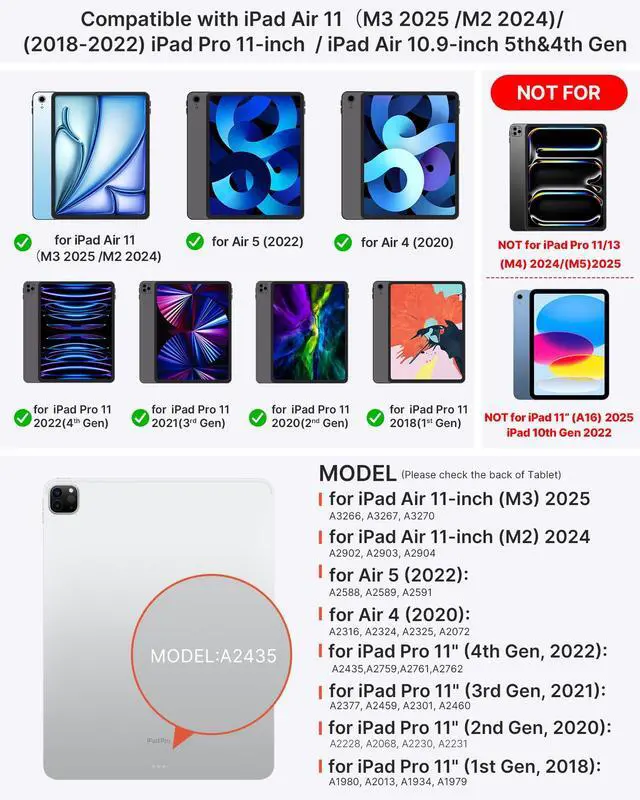 : 2025 iPad Air 11" M3 (Model: A3266, A3267, A3270), 2024 iPad Air 11" M2 (Model: A2902, A2903, A2904), 2022 iPad Pro 11" 4th Gen (Model: A2759, A2435, A2761, A2762), 2021 iPad Pro 11" 3rd Gen (Model: A2377, A2301, A2459, A2460), 2020 iPad Pro 11" 2nd Gen (Model: A2228, A2068, A2230, A2231), 2018 iPad Pro 11" 1st Gen (Model: A1980, A2013, A1934, A1979), 2022 iPad Air 10.9" 5th Gen (Model: A2588, A2589, A2591), 2020 iPad Air 10.9" 4th Gen (Model: A2072, A2316, A2324, A2325). Note: This product supports iPad bare device use only.
