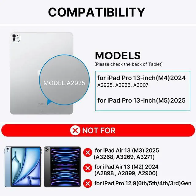 : Elevate your iPad Pro 13 inch (M5 2025 / M4 2024) experience with our versatile keyboard case. Supported models: A2925,A2926,A3007. Due to the different arrangement of the magnets, this magic keyboard case is Not compatible with other iPad models.If you're unsure about compatibility, feel free to reach outwe're happy to help!