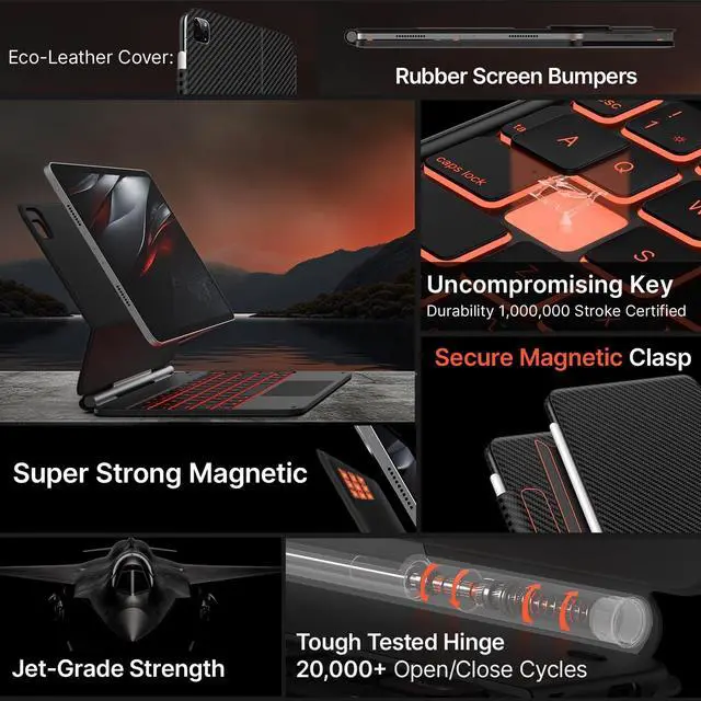 ^^: Elevate your iPad experience with our precise, versatile keyboard. Effortlessly navigate work and play with a full-area trackpad.