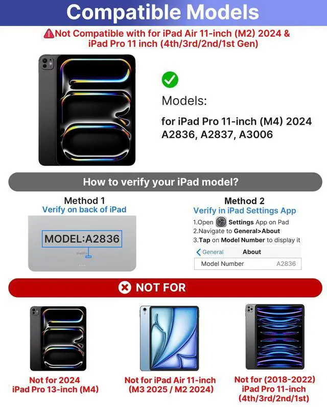 : Elevate your iPad Pro 11 inch (M4) 2024 experience with our versatile keyboard case. Supported models: A2836, A2837, A3006;Due to the different arrangement of the magnets, this magic keyboard case is Not compatible with other iPad models.If you're unsure about compatibility, feel free to reach outwe're happy to help!