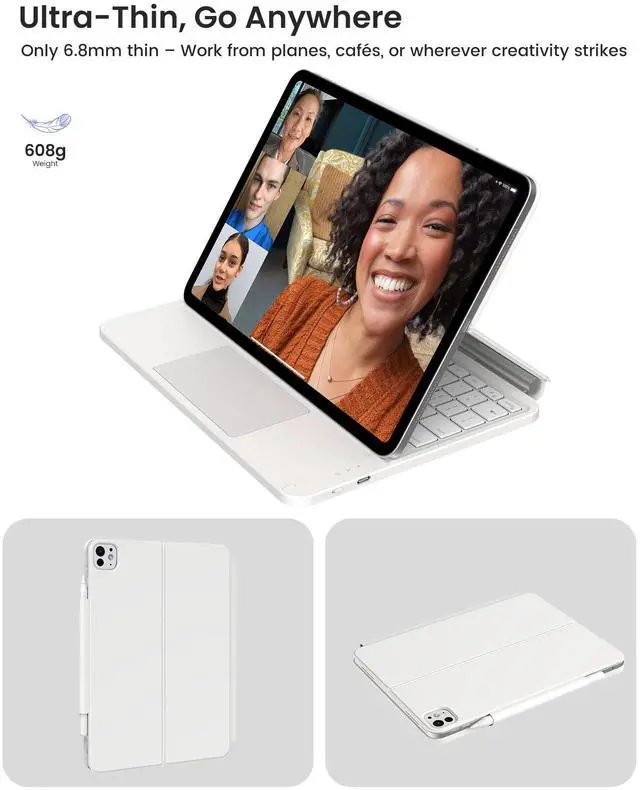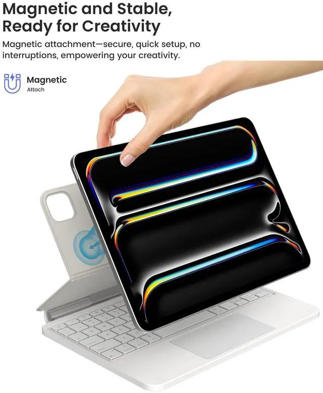 :Elevate your iPad experience with our precise, versatile keyboard. Effortlessly navigate work and play with a full-area trackpad.