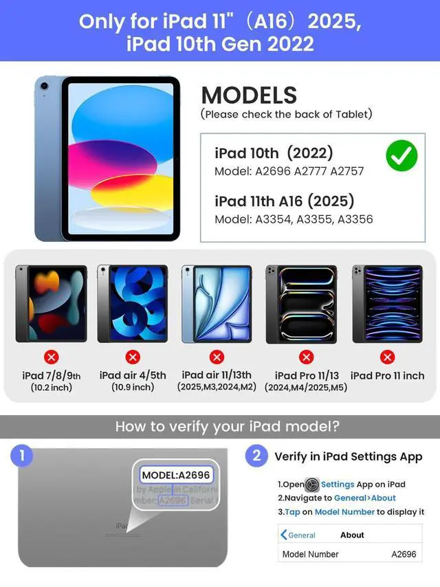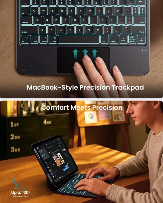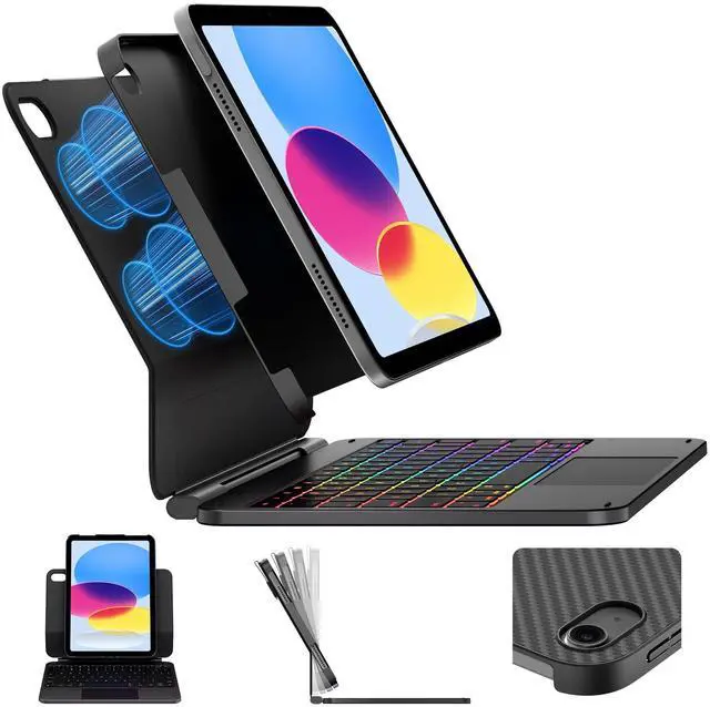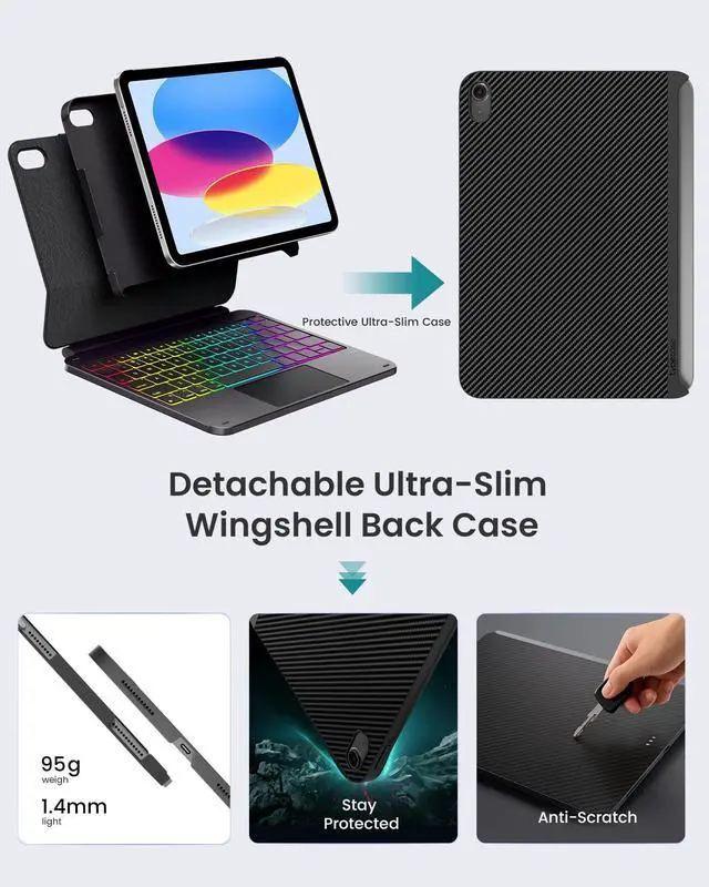 : Designed for iPad 11th Generation (11", 2025, A16 Chip A3354, A3355, A3356) and iPad 10th Generation ( 10.9", 2022 A2696, A2757, A2777). The precise magnetic fit ensures stable performance and seamless connection. Please confirm your model before purchase ^^ -: Now includes a detachable, ultra-slim protective shell for enhanced protection. It shields the edges and back of your iPad while maintaining a sleek profileideal for daily use, travel, and classroom or office setups ^^ - + -: Enjoy smooth, MacBook-like control with responsive scissor keys and a precision multi-touch trackpad that supports iPadOS gestures. Perfect for writing, browsing, and editing with maximum efficiency ^^: Work comfortably day or night with 11-color adjustable RGB backlighting and 3 brightness levels. Personalize your typing environment and maintain productivity in any lighting condition ^^ +