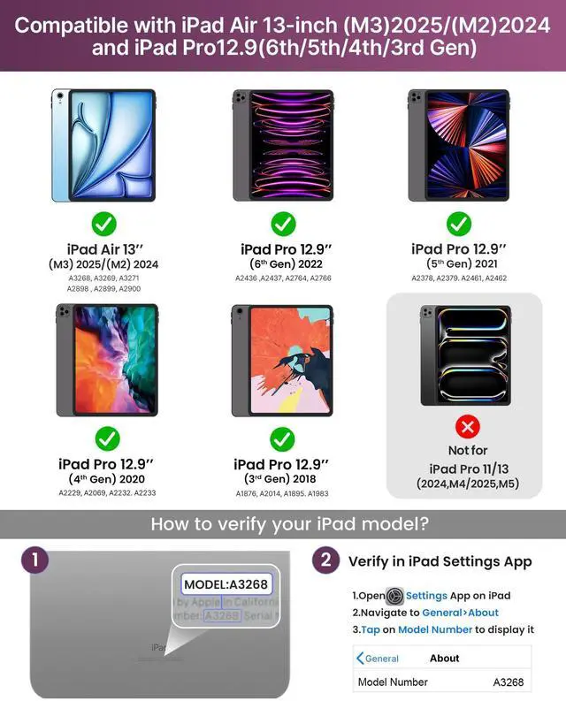 : Designed for iPad Air 13-inch (M3 2025 / M2 2024) and iPad Pro 12.9 -inch models, including Air 13 M3 2025 (A3268, A3269, A3271), Air 13 M2 2024 (A2898, A2899, A2900), iPad Pro 12.9 6th Gen 2022 (A2436, A2437, A2764, A2766), iPad Pro 12.9 5th Gen 2021 (A2378, A2379, A2461, A2462), iPad Pro 12.9 4th Gen 2020 (A2229, A2069, A2232, A2233), iPad Pro 12.9 3rd Gen 2018 (A1876, A2014, A1895, A1983); not compatible with other iPad models due to different magnet layouts; contact us if unsure.