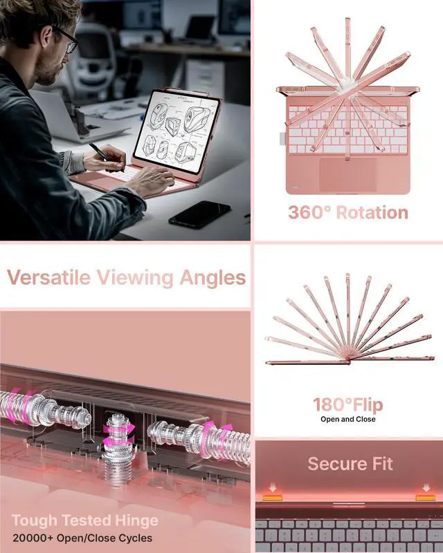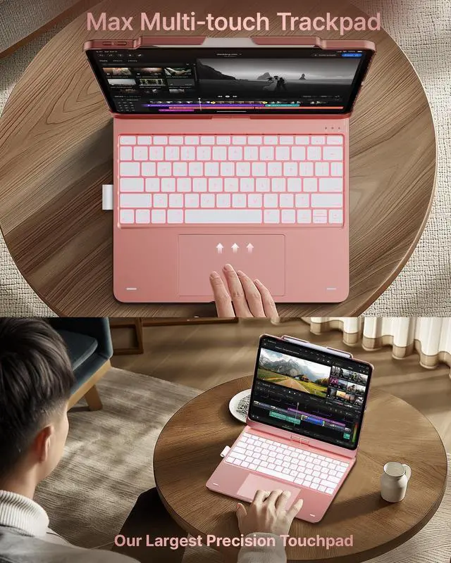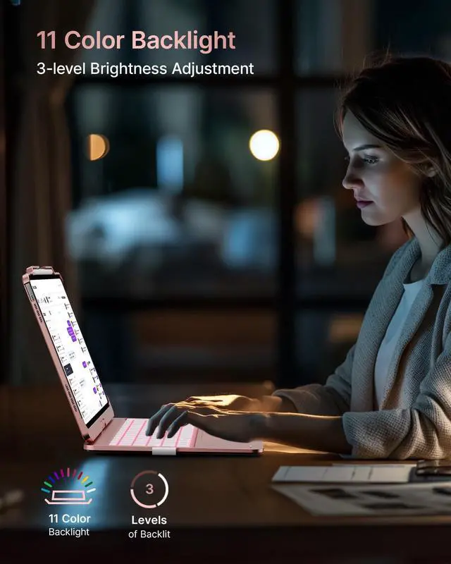 Adjustable Brightness: This iPad Air 13 inch keyboard offers 11 backlight colors and 3 brightness levels, providing a personalized typing experience. Whether you're in an office, library, or a dimly lit cafe, you can adjust the backlight's brightness and color to ensure comfort in any lighting condition. ^^ 360 Rotatable Design with 7