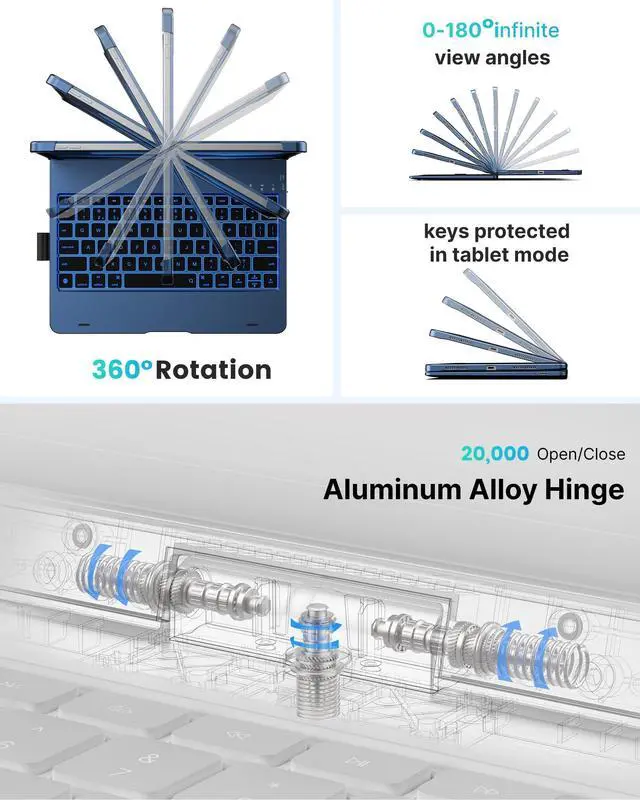 Use Modes: The patented 360 hinge, stress-tested for 20, 000 cycles, adapts to any task. Whether typing, viewing, or using your iPad in tablet mode, enjoy the flexibility and convenience for every scenario.