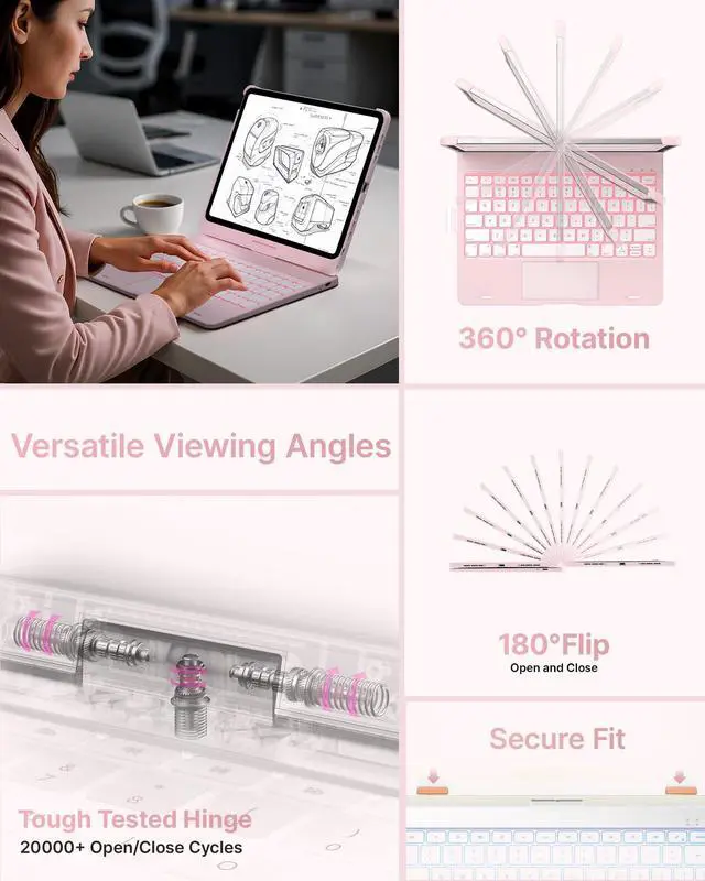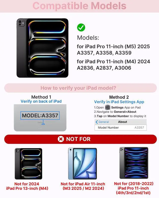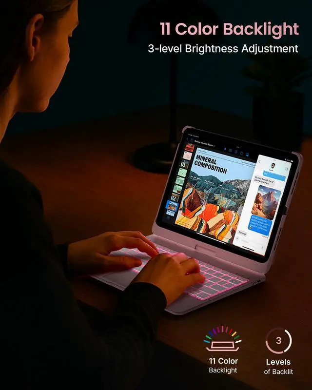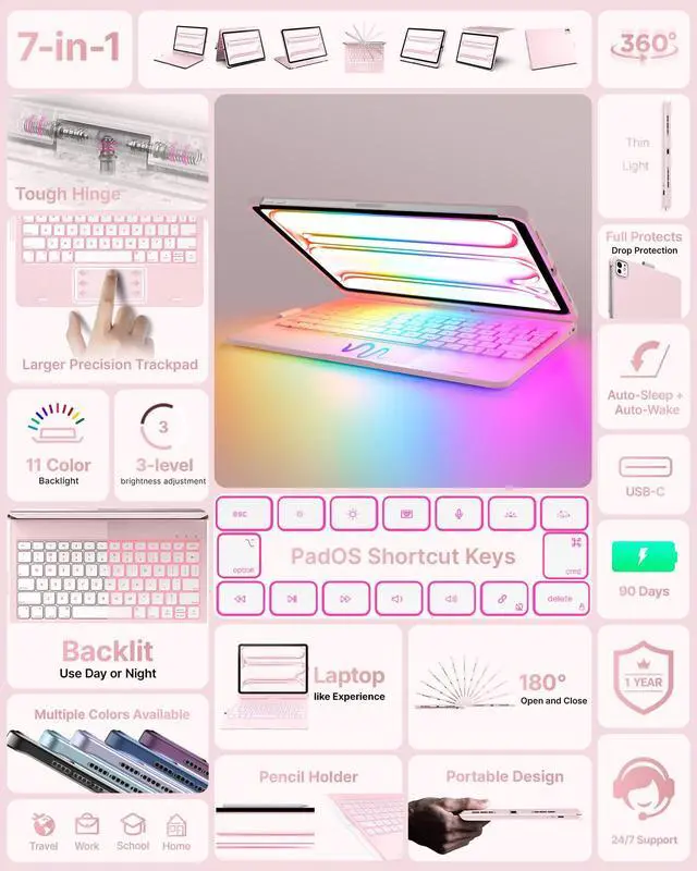 Pro 11-inch (M4) 2024 (models: A2836, A2837, A3006), ensuring a perfect fit. Please check your iPads model number (starting with "A") on the back before purchasing. This case is NOT compatible with other iPad models due to size and thickness variations. Unsure about compatibility? Just askwe're happy to help! ^^ Precision TrackpadNavigate your iPad Pro 11-inch (M5 2025 / M4 2024) with effortless precision. Featuring a highly responsive and ultra-precise trackpad, this keyboard case lets you swipe, scroll, and multitask with ease. Edit documents, browse the web, and build presentations seamlesslyall at your fingertips. ^^ 11-Color RGB Backlit KeysType in style, day or night, with our 11-color RGB backlit keyboard. Designed for a premium, laptop-like typing experience, this keyboard features laser-etched keys with 3 adjustable brightness levels. A full row of iPadOS shortcuts lets you work efficiently with a single tap. ^^ 7 Use ModesWork, watch, and createyour way. The dual-axis 360 rotatable hinge, tested for 20, 000+ cycles, lets you switch effortlessly between 7 versatile modes. Whether you're presenting, sketching, or binge-watching, find the perfect angle for any task.
