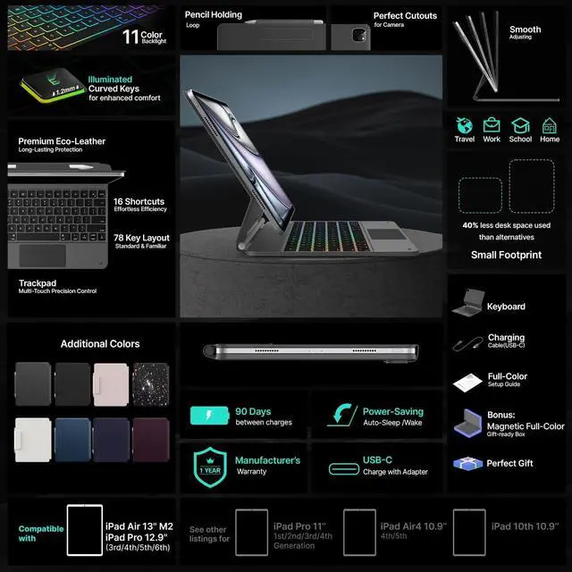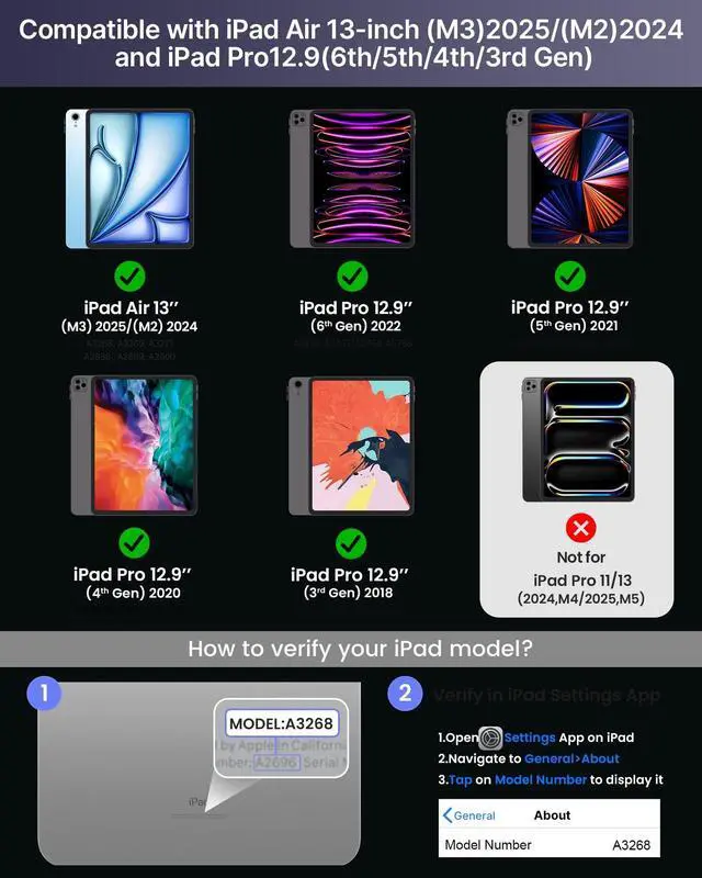 : Designed for iPad Air 13-inch (M3 2025 / M2 2024) and iPad Pro 12.9 -inch models, including Air 13 M3 2025 (A3268, A3269, A3271), Air 13 M2 2024 (A2898, A2899, A2900), iPad Pro 12.9 6th Gen 2022 (A2436, A2437, A2764, A2766), iPad Pro 12.9 5th Gen 2021 (A2378, A2379, A2461, A2462), iPad Pro 12.9 4th Gen 2020 (A2229, A2069, A2232, A2233), iPad Pro 12.9 3rd Gen 2018 (A1876, A2014, A1895, A1983); not compatible with other iPad models due to different magnet layouts; contact us if unsure.