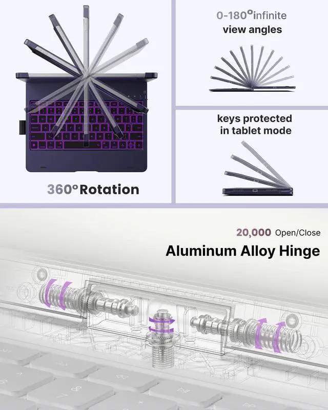 Use Modes: The patented 360 hinge, stress-tested for 20, 000 cycles, adapts to any task. Whether typing, viewing, or using your iPad in tablet mode, enjoy the flexibility and convenience for every scenario ^^