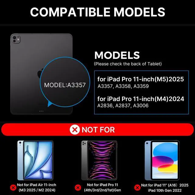 • : Elevate your iPad Pro 11 inch (M5 2025 / M4 2024) experience with our versatile keyboard case. Supported models: A3357, A3358, A3359, A2836, A2837, A3006;Due to the different arrangement of the magnets, this magic keyboard case is Not compatible with other iPad models.If you're unsure about compatibility, feel free to reach outwe're happy to help!