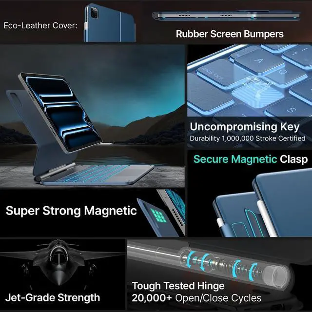 • :Elevate your iPad Pro M5/M4 11 inch experience with our precise, versatile keyboard. Effortlessly navigate work and play with a full-area trackpad.