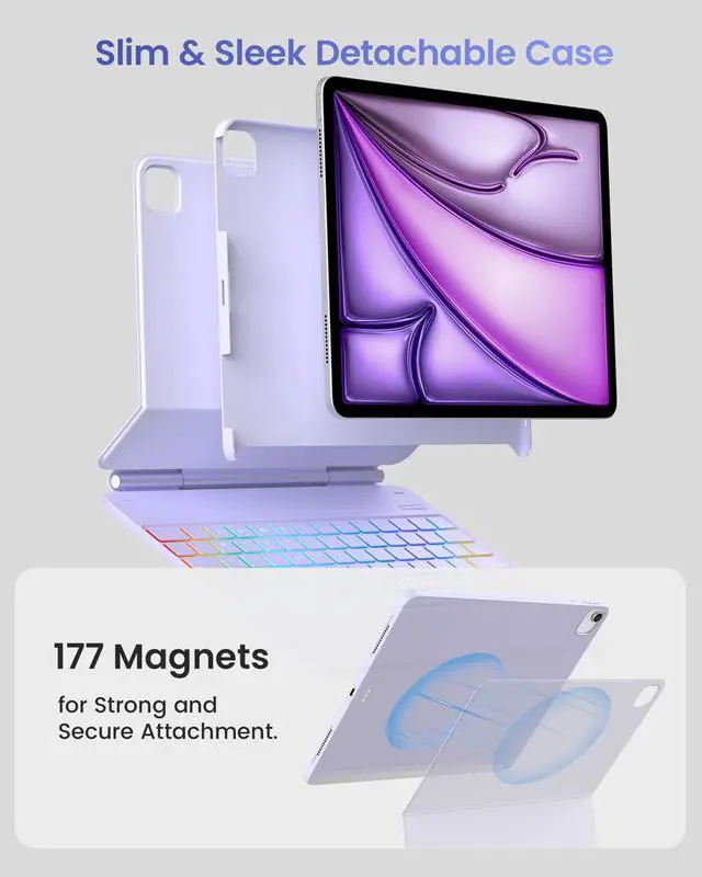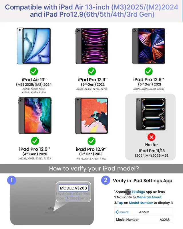 : Elevate your iPad Air 13 inch (M3 2025 / M2 2024) or iPad Pro 12.9 experience with our versatile keyboard case. Compatible with iPad Air 13 inch (M3 2025 / M2 2024), iPad Pro 12.9 ( 6th/5th/4th/3rd gen), models include 2025 Air 13 inch(A3268, A3269, A3271), 2024 Air 13 inch(A2898, A2899, A2900), 2022 12.9 inch Pro 6th Gen(A2436, A2437, A2764, A2766); 2021 12.9 inch Pro 5th Generation (A2378, A2379, A2461, A2462); 2020 12.9 inch Pro 4th Generation (A2229, A2069, A2232, A2233); 2018 12.9 inch Pro 3rd Generation (A1876, A2014, A1895, A1983).