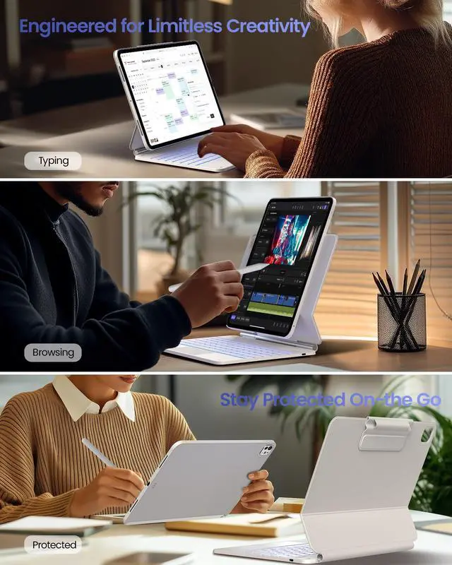 ^^: The keyboard features well-spaced, responsive keys with 11 backlight options, 3 adjustable brightness levels, and iPadOS shortcuts. Additionally, the ergonomic design ensures comfortable typing for extended periods, boosting work efficiency and typing speed.