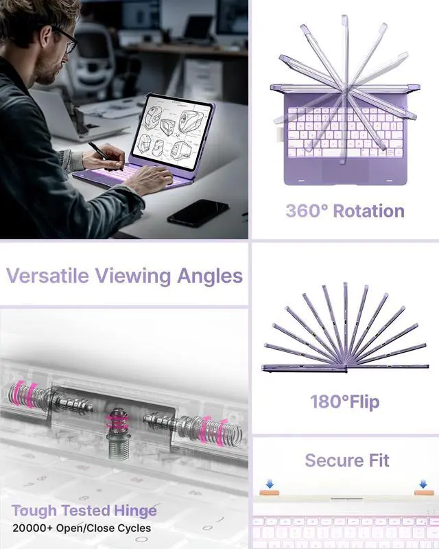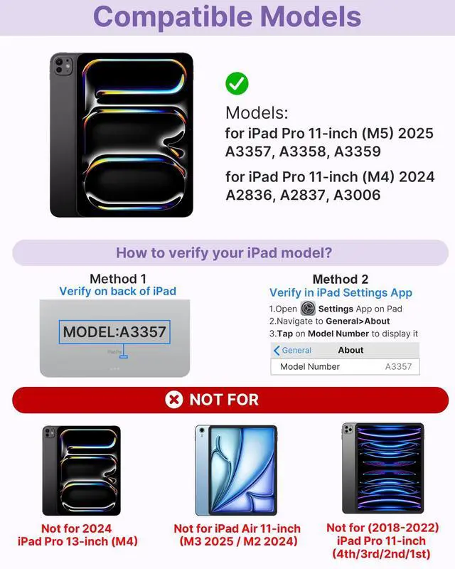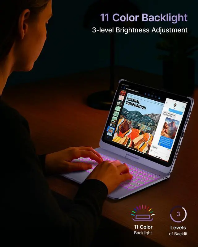 Pro 11-inch (M4) 2024 (models: A2836, A2837, A3006), ensuring a perfect fit. Please check your iPads model number (starting with "A") on the back before purchasing. This case is NOT compatible with other iPad models due to size and thickness variations. Unsure about compatibility? Just askwe're happy to help! ^^ Precision TrackpadNavigate your iPad Pro 11-inch (M5 2025 / M4 2024) with effortless precision. Featuring a highly responsive and ultra-precise trackpad, this keyboard case lets you swipe, scroll, and multitask with ease. Edit documents, browse the web, and build presentations seamlesslyall at your fingertips. ^^ 11-Color RGB Backlit KeysType in style, day or night, with our 11-color RGB backlit keyboard. Designed for a premium, laptop-like typing experience, this keyboard features laser-etched keys with 3 adjustable brightness levels. A full row of iPadOS shortcuts lets you work efficiently with a single tap. ^^ 7 Use ModesWork, watch, and createyour way. The dual-axis 360 rotatable hinge, tested for 20, 000+ cycles, lets you switch effortlessly between 7 versatile modes. Whether you're presenting, sketching, or binge-watching, find the perfect angle for any task.
