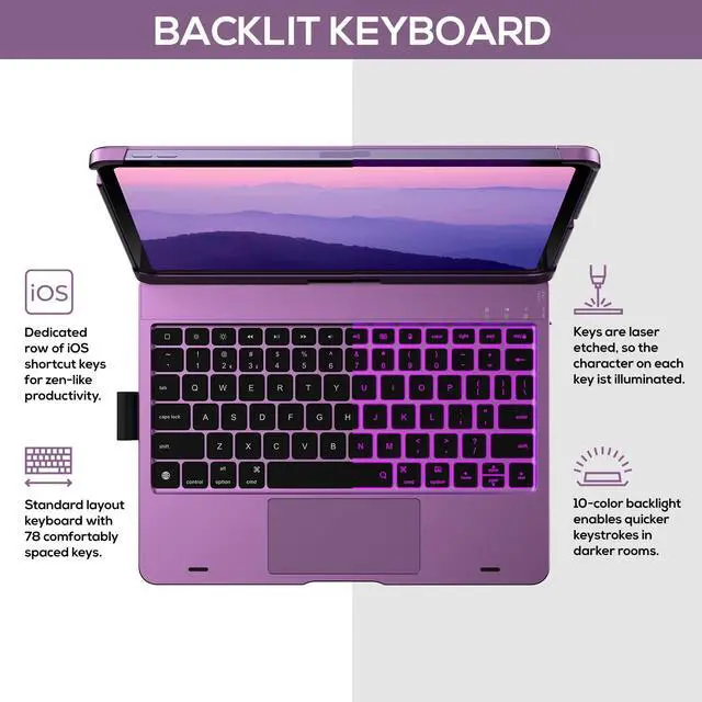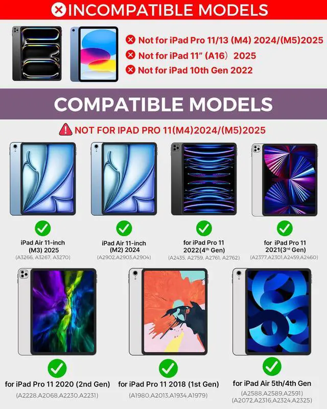 Compatibility: Only for iPad Air 11-inch (M3 2025 / M2 2024) & iPad Pro 11-inch 4th/3rd/2nd/1st gen(2018-2022), iPad Air 5th/4th gen. Models include Air 11-inch (M3) 2025 (A3266, A3267, A3270), Air 11-inch (M2) 2024 (A2902, A2903, A2904), 2022 Pro 11 4th Gen (A2759, A2435, A2761, A2762), 2021 Pro 11 3rd Gen (A2377, A2301, A2459, A2460), 2020 Pro 11 2nd Gen (A2228, A2068, A2230, A2231), 2018 Pro 11 1st Gen(A1980, A2013, A1934, A1979), 2022 10.9 -inch Air 5th GenA2588, A2589, A2591), Air 4th Gen (A2072, A2316, A2324, A2325). ^^ Precision Trackpad - The iPad Pro 11 inch case 4th generation with keyboard has a unique design with high precision Trackpad, navigate your iPad Pro 11-inch 4th generation in a whole new way with your fingers. Edit documents, browse the web, and build presentations with unparalleled speed, bringing you the convenience of high productivity. ^^ 11-Color RGB Backlit Keys - Premium laptop-like keyboard case for iPad Pro 11-inch 3rd gen, designed for maximizing typing experience, type on 11-color RGB laser-etched keys.