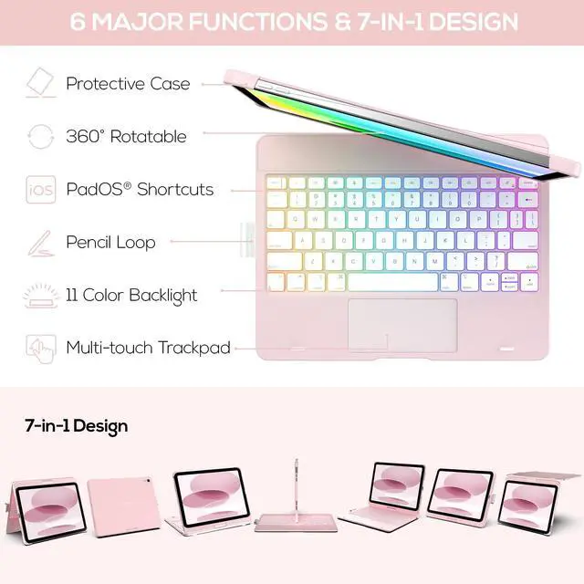 Compatibility: Designed for iPad 10th Generation ( 10.9", 2022 Models A2696 A2757 A2777) and iPad 11th Generation (11", 2025, A16 Chip Models A3354 A3355 A3356). Please check the model number on the back of your iPad to ensure a perfect fit ^^ Precision Trackpad - Navigate iPad in a whole new way with multi-gesture controls that redefine productivity; edit documents, browse the web and build presentations with unparalleled speed. ^^ Illuminated Typing - Type quickly and accurately on a laptop-like keyboard with a full row of iPadOS shortcuts and laser-etched keys that allow an adjustable 14-color RGB LED backlight to shine through. ^^ 7 Use Modes - A patented 360 hinge (20, 004-cycle stress tested) lets you comfortably use iPad for any task from typing notes to watching videos to using iPad in its native form in tablet mode. ^^ Smart Features - Premium hard-shell design protects all sides of your iPad; auto sleep/wake initiates when keyboard case is opened & closed to conserve battery life; holder for Apple Pencil so it won't get lost or in the way. ^^ Long-Lasting Battery and