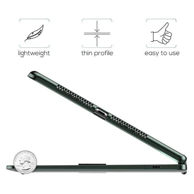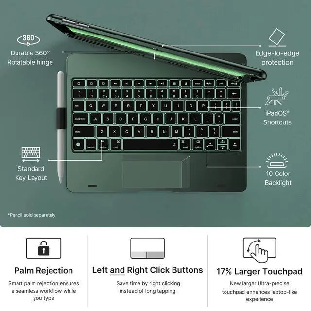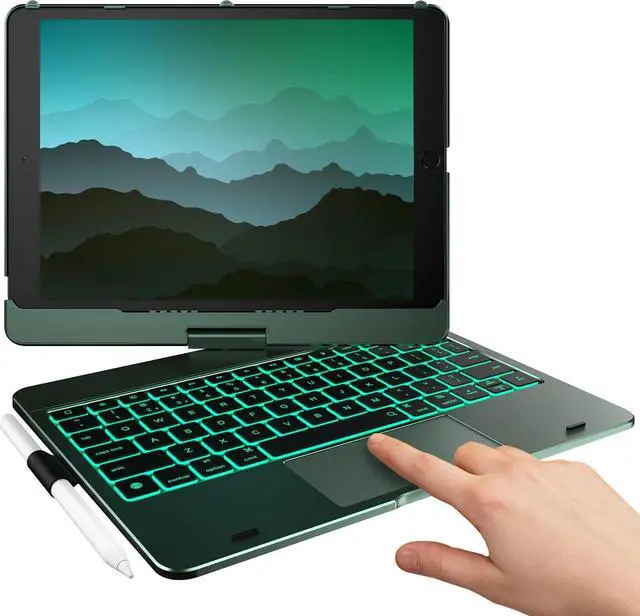 Compatibility: Compatible with iPad 9th Gen (2021, 10.2 inch) Models A2602 A2603 A2604 A2605; iPad 8th Gen (2020, 10.2 inch) Models A2270 A2428 A2429 A2430; iPad 7th Gen (2019, 10.2 inch) Models A2200 A2197 A2198; iPad Air 3rd Gen (2019, 10.5 inch) Models A2123 A2152 A2153 A2154; iPad Pro (2017, 10.5 inch) Models A1701 A1709 A1852. Please check your iPad model number on the back of your device (starting with "A") before purchasing to ensure compatibility. ^^ Precision Trackpad - Navigate iPad in a whole new way with multi-gesture controls that redefine productivity; edit documents, browse the web and build presentations with unparalleled speed. ^^ Illuminated Typing - Type quickly and accurately on a laptop-like keyboard with a full row of iPadOS shortcuts and laser-etched keys that allow an adjustable 18-color RGB LED backlight to shine through. ^^ 7 Use Modes - A patented 360 hinge (20, 008-cycle stress tested) lets you comfortably use iPad for any task from typing notes to watching videos to using iPad in its native form in tablet mode. ^^ Smart Features - Premium hard-shell design protects all sides of your iPad; auto sleep/wake initiates when keyboard case is opened & closed to conserve battery life; holder for Apple Pencil so it won't get lost or in the way.