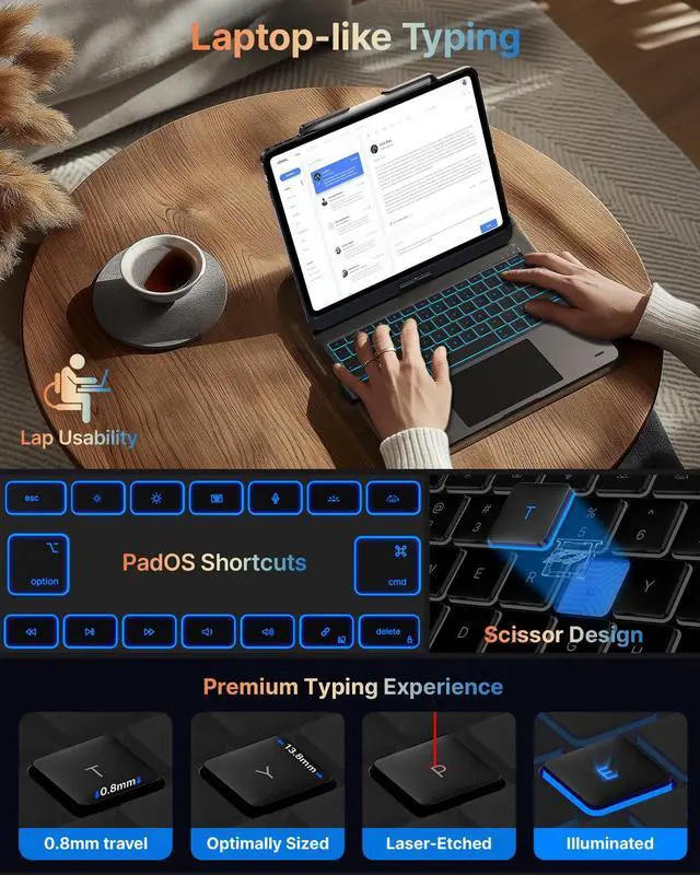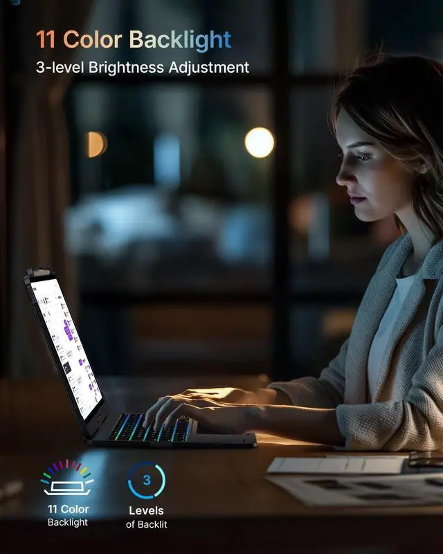 Adjustable Brightness: This iPad Air 13 inch keyboard offers 11 backlight colors and 3 brightness levels, providing a personalized typing experience. Whether you're in an office, library, or a dimly lit cafe, you can adjust the backlight's brightness and color to ensure comfort in any lighting condition. ^^ 360 Rotatable Design with 7