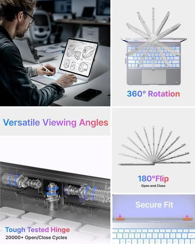 Viewing Modes: iPad Air 13 inch keyboard switch effortlessly between landscape and portrait to fit your day: typing, viewing, reading, sketching, and presenting. The stable hinge delivers reliable angles for desk and lap use, making it ideal for remote work, commuting, meetings, studying, note-taking, drawing, and streaming.