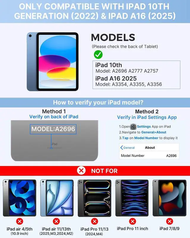 Gen (2022) 10.9 -inch (Models: A2696, A2757, A2777). Not compatible with other iPad models; Please check the model number on the back of your iPad to ensure a perfect fit ^^ 7