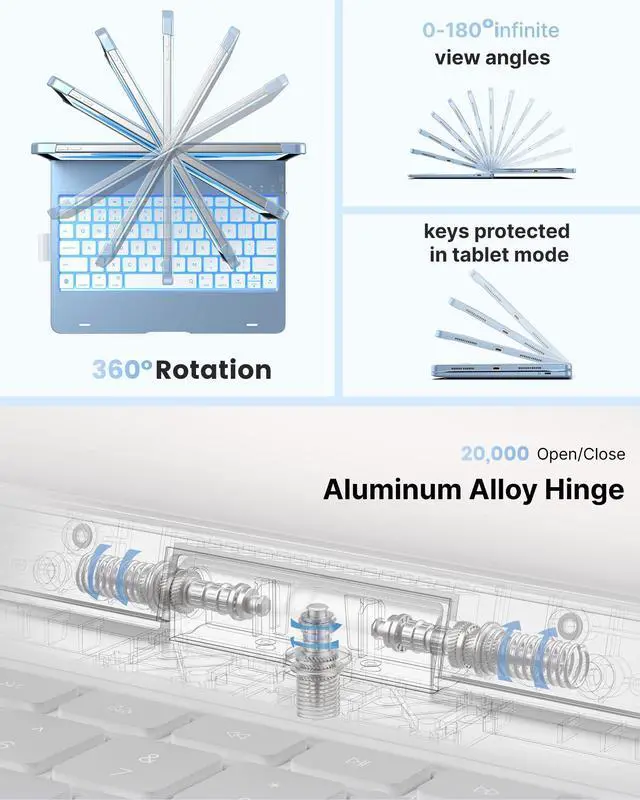 Use Modes: The patented 360 hinge, stress-tested for 20, 000 cycles, adapts to any task. Whether typing, viewing, or using your iPad in tablet mode, enjoy the flexibility and convenience for every scenario ^^