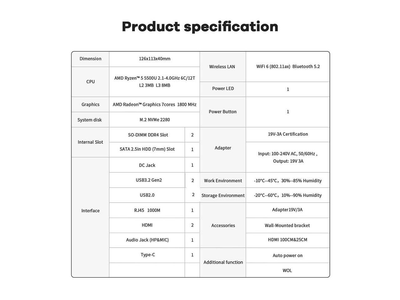 - [(Compact & Rich Interface)] Easy to setup and small in size. WiFi 6 (802.11ax) + Bluetooth 5.2 is faster and more stable. Gigabit Ethernet RJ45 2.5G network connectivity. Beelink SER5 mini computer is equipped with 1x type-C(data), 1XHDMI, 1XDP, 2x USB 3.2, 2x USB 2.0, 1 x2.5G Gigabit Ethernet, 3.5mm Audio Jack. Large fan and dual heat conduction tube make heat dissipation more efficient, which helps this mini pc works better. And It can be fixed on the back of the monitor to save your workstation.