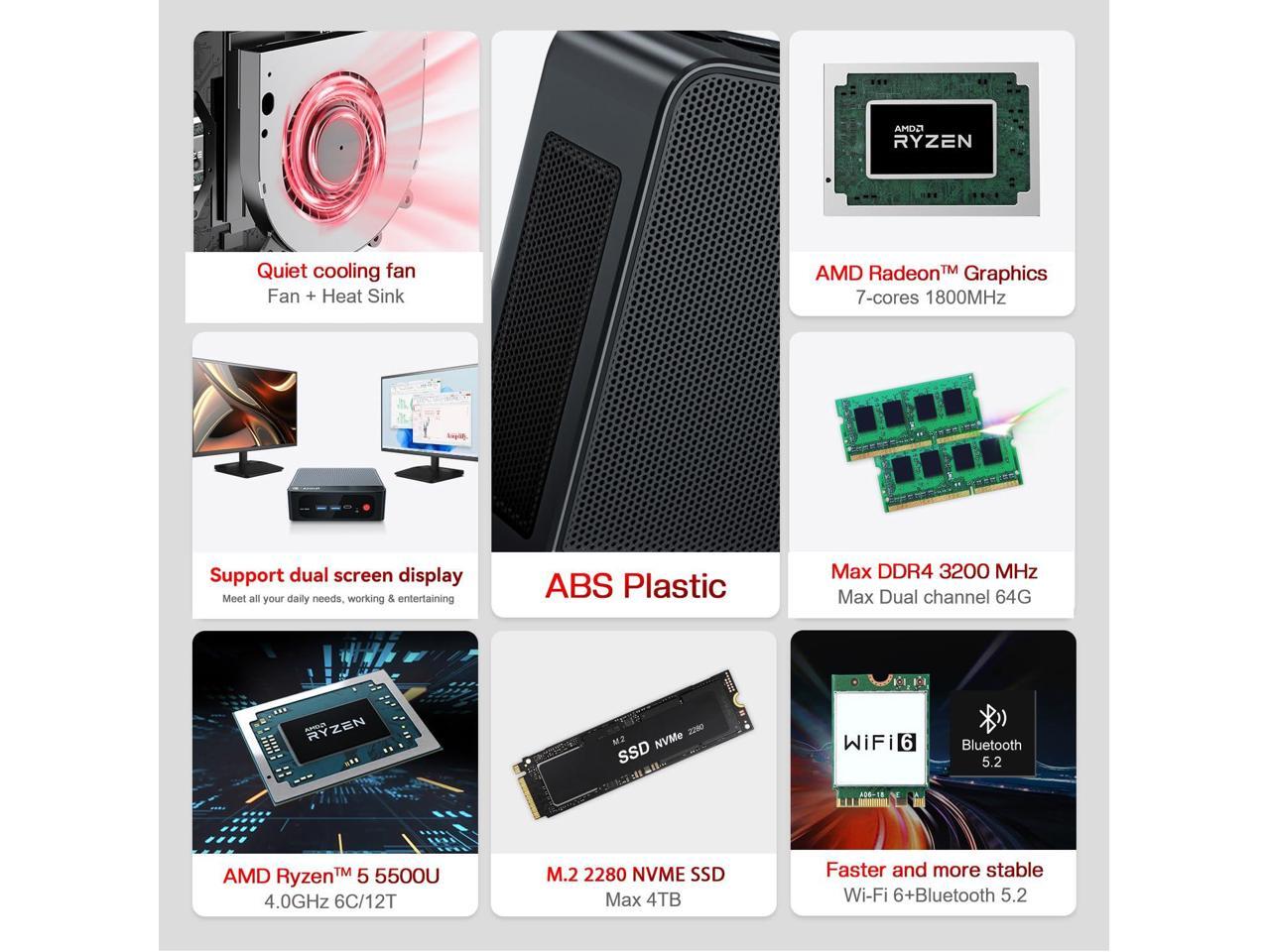- [(Tower Performance & Powerful Processor)] Powered with AMD Ryzen 5500U, 6 Core/12 Threds, 2.1GHz up to 4.0GHz, which can turn your desk into a powerful workstation just by adding a keyboard, mouse. Pre-installed with W-11 without any bloatware. The Beelink SER5 mini pc can be used for video and photo editing, office tasks, 4K video playback, gaming , and virtualization work.