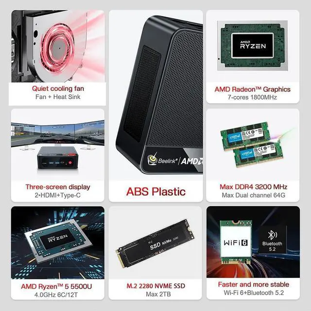Beelink Mini PC SER5 Mini Pc Ryzen 5 5500U 6C 12T ( 2.1 ~ 4.0GH z) 16GB RAM 500GB NVME SSD/WiFi 6/BT 5.2 /Typc 3.0 +2*HDMI 4K @ 60Hz 3 Screen Output, Supports 2.5" HDD/SSD