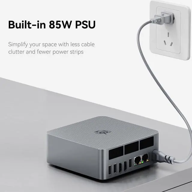 Heat pipe, silent fan and heat fins quickly push the heat out of the AI PC, avoiding CPU overheating and throttling, offering efficient cooling for the SSD and RAM. ^^ Multiple Interfaces & PSUBeelink Mini PC has a unique interface designed with 3 x USB 3.2 Gen2 (10Gbps), 1 x USB 2.0 480Mbps, 1 x Type-C(data, 10Gbps), 2 x HDMI (Max 4K 60Hz), 1 x AC Jack, 2 x RJ45 RTL8111H 1000M, 1 x 3.5 mm Phone Jack*1(Two-in-one)Realtek ALC897. Mini PC wears a power LED, power button, reset button.