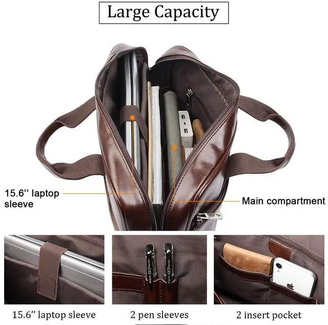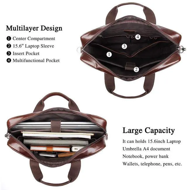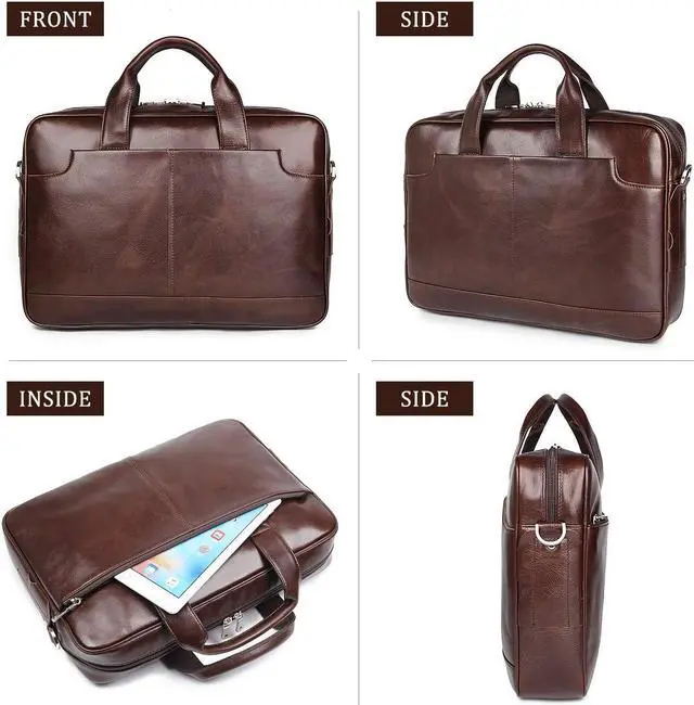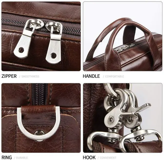 Material: 1. the leather: this Mens briefcase is made of 100% full grain leather. 2 . the zipper: We use high quality YKK Zipper explosion-proof material to ensure quality and reliability. 3. the Hardware: we use the one-time casting shaping, not splicing workmanship, we can ensure its durable for long time . 4. the lining: made of soft cotton cloth.