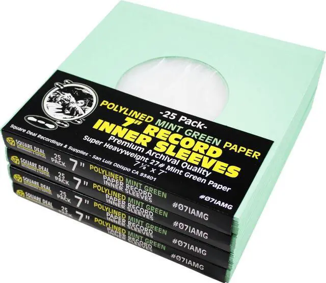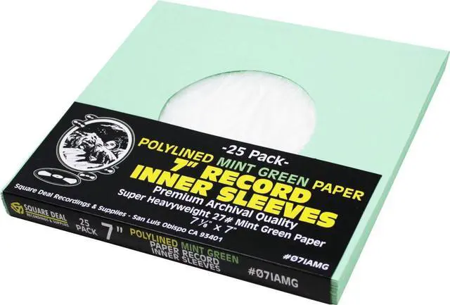 These 7" polylined mint green paper inner sleeves are the perfect mix of album protection and rigidity for easy insertion! The High Density Polyethylene (HDPE) inner layer protects your vinyl from scratching and dust, while the super heavyweight (27#) paper exterior makes the record stand up nicely inside the jacket. Archival Quality, Acid-Free, Static Free - PREMIUM PROTECTION for your 7" Vinyl Records. Exterior Flaps, and 1/4" Lip Allow for Easy Record Insertion. Each Sleeve Measures 7-1/8" wide by 7" tall - the perfect fit! These sleeves provide superior protection for your record collection, and are the perfect size! Protect your investment with sleeves from Square Deal Recordings & Supplies - an industry leader for record supplies since 1972.