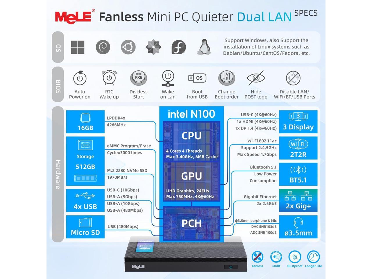 - [Newest Gen12th CPU-N100] MeLE Quieter DL adopts 2023 12th Alder Lake N100 (Up to 3.4GHz, 6MB L3 Smart Cache) processor. Compared with i7-5600U/ i5-6500T, N100 CPU single core performance +85%; compared to N5105/N5095, N100 CPU performance +38%, more powerful performance. Adopts brand new 4266MHz LPDDR4x, 6MB L3 Cache, running faster and more smoothly. Compatible with Windows and Linux OS.