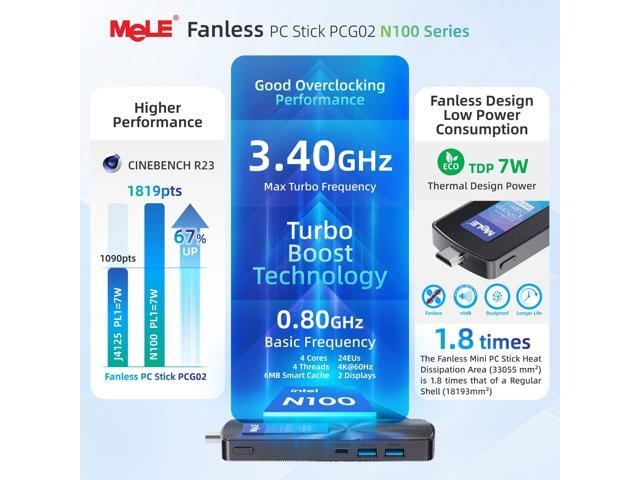- [( Newest Gen12th CPU-N100 )] MeLE PCG02 N100 mini PC stick adopts 12th Gen Alder Lake N100 (Up to 3.4GHz, 6MB L3 Smart Cache) processor. Compared with i7-5600U/ i5-6500T, N100 CPU single core performance +85%; compared to N5105/N5095, N100 CPU performance +38%, more powerful performance and smoother running. Compatible with Linux Ubuntu, Debian, etc.