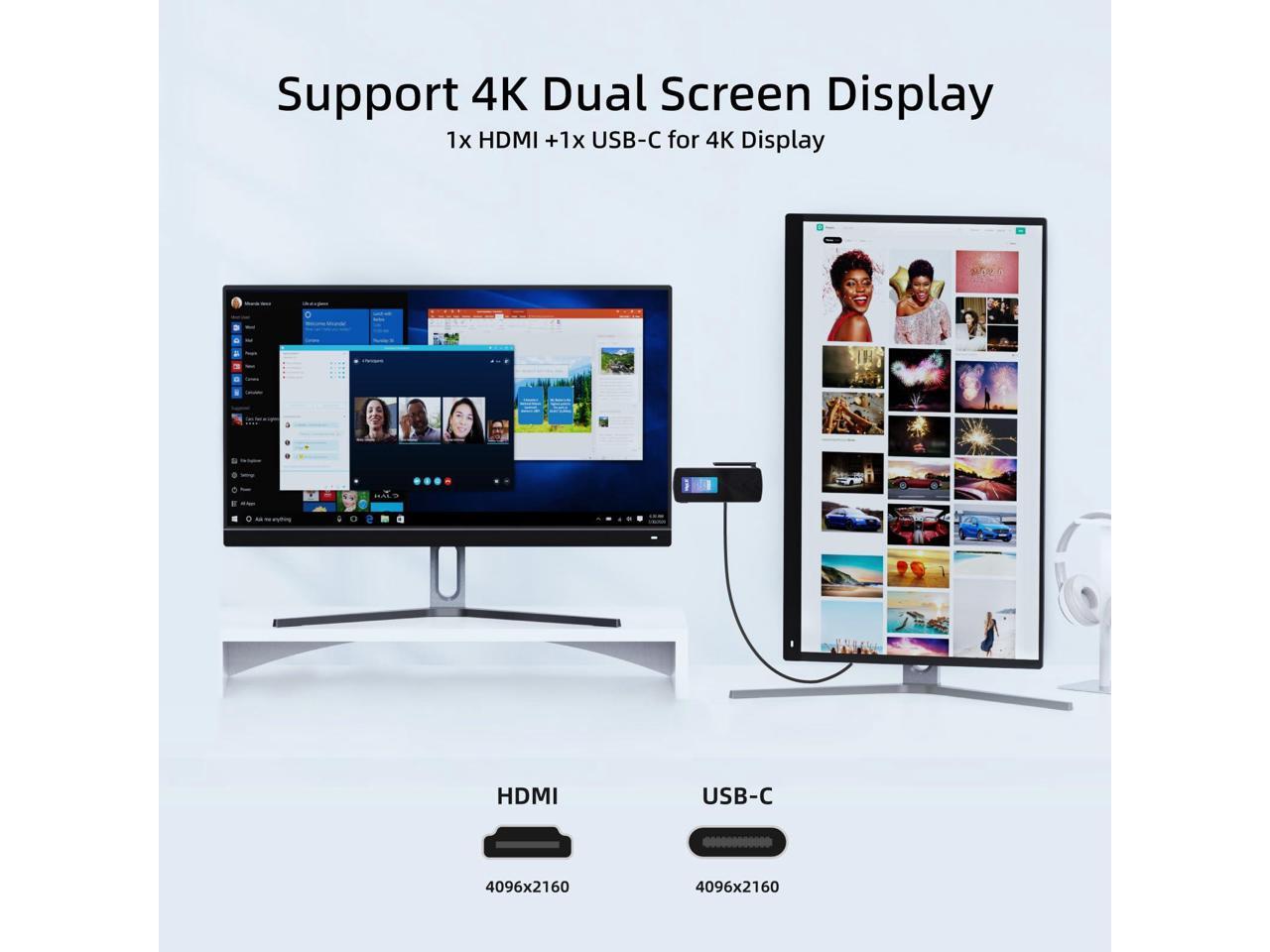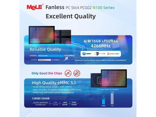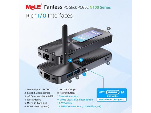 - [( Support 4K Dual Screen Display )] MeLE PCG02 N100 mini stick computer is built in 750MHz Intel UHD Graphics, supports 1x HDMI 2.0 + 1x USB Type-C (DP1.4) 4K dual display, the high-definition playback function brings you a stunning movie-watching experience. Two Graphics output interfaces can be easily connected to two monitors at the same time, no need to switch back, reduce unnecessary operations. Ideal for business, IoT, MES, WMS, digital signage, etc.