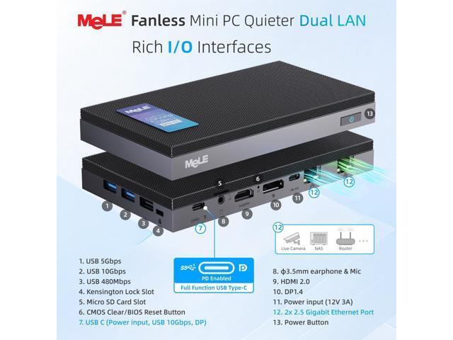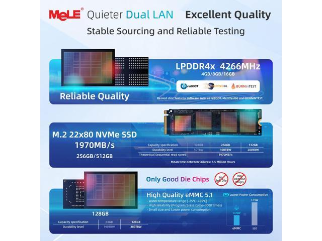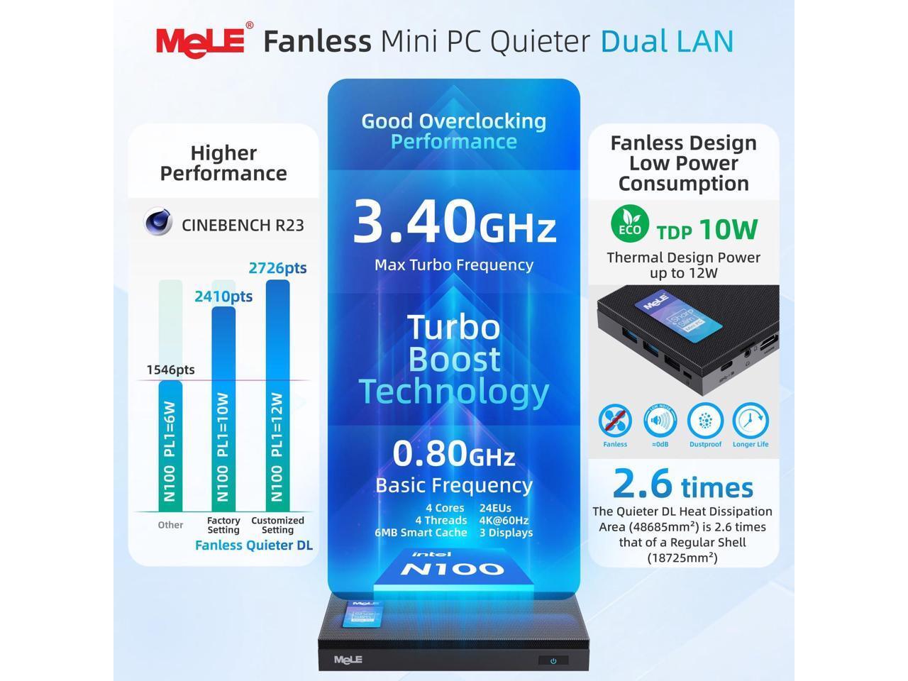 - [Newest Gen12th CPU-N100] MeLE Quieter DL adopts 2023 12th Alder Lake N100 (Up to 3.4GHz, 6MB L3 Smart Cache) processor. Compared with i7-5600U/ i5-6500T, N100 CPU single core performance +85%; compared to N5105/N5095, N100 CPU performance +38%, more powerful performance. Adopts brand new 4266MHz LPDDR4x, 6MB L3 Cache, running faster and more smoothly. Compatible with Windows and Linux OS.