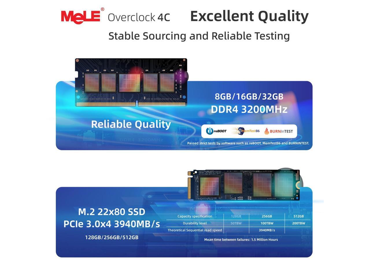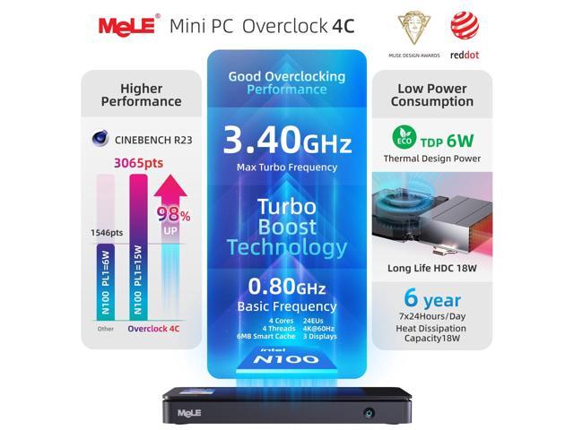 - Newest Gen12th CPU-N100 MeLE Quieter4C adopts 2023 12th Alder Lake N100 (Up to 3.4GHz, 6MB L3 Smart Cache) processor. Compared with i7-5600U/ i5-6500T, N100 CPU single core performance +85%; compared to N5105/N5095, N100 CPU performance +38%, more powerful performance and smoother running. Support Linux Ubuntu, Debian, etc.
