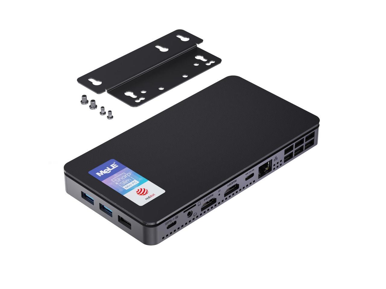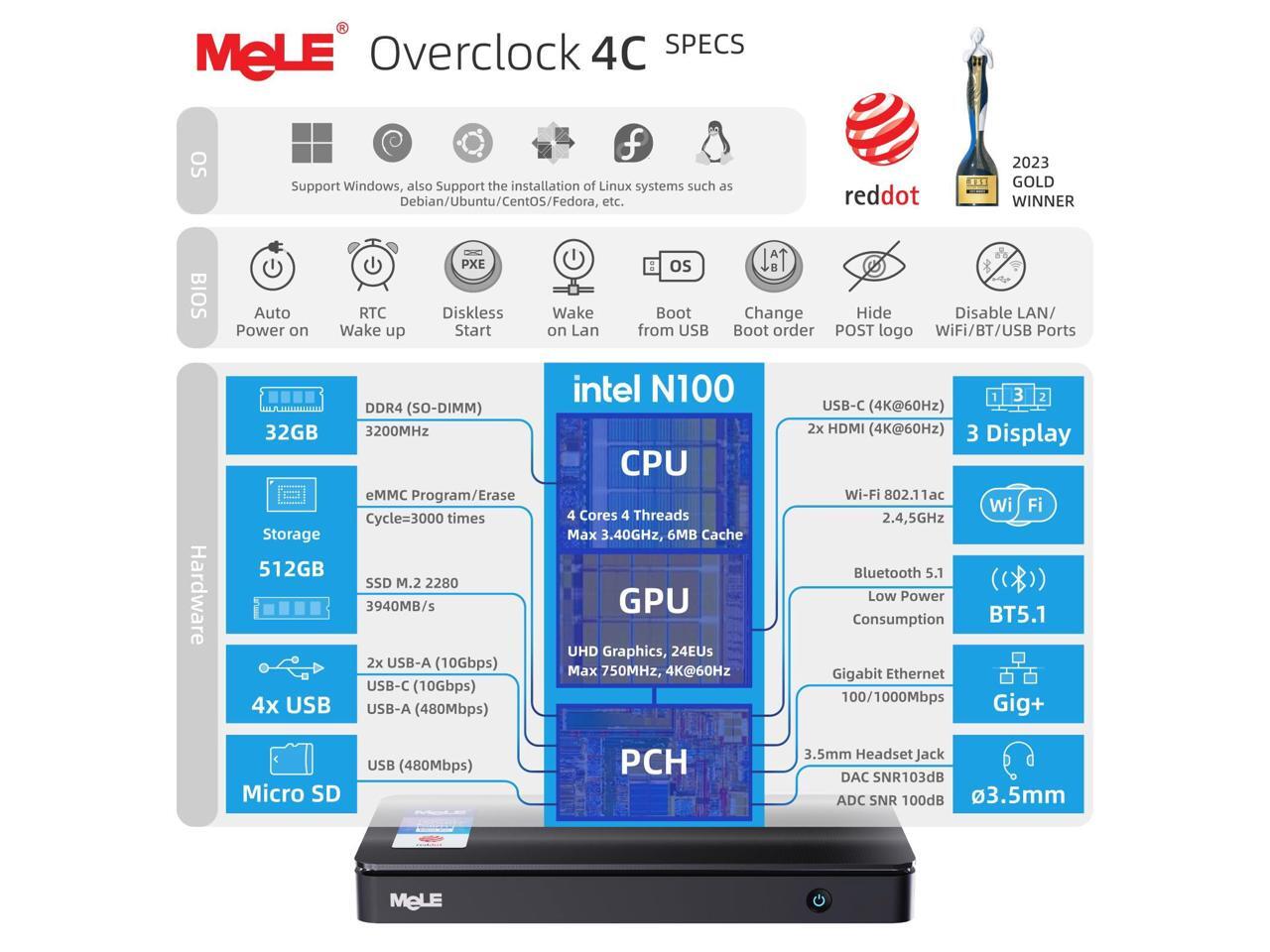 MeLE Reddot Winner Overclock 4C N100 (up to 3.4GHz) Slim Mini PC 32GB DDR4 512GB SSD Dual HDMI + USB Type C 4K Triple Display 2.4GHz/5GHz WiFi BT5.2 GbE Micro PC, Support Linux Small Desktop Computer