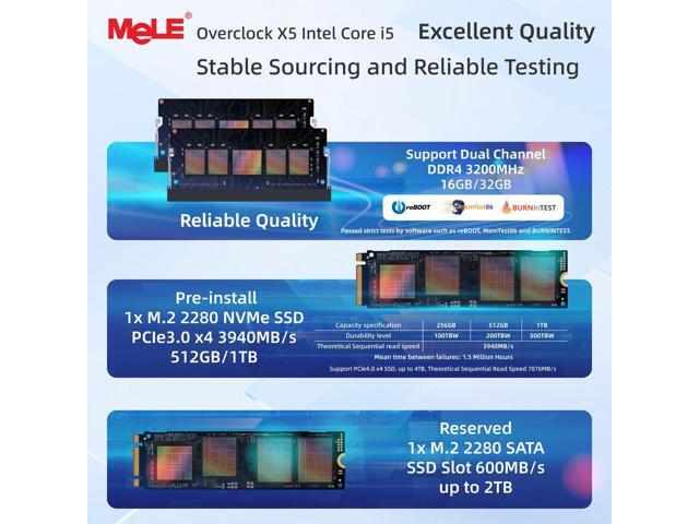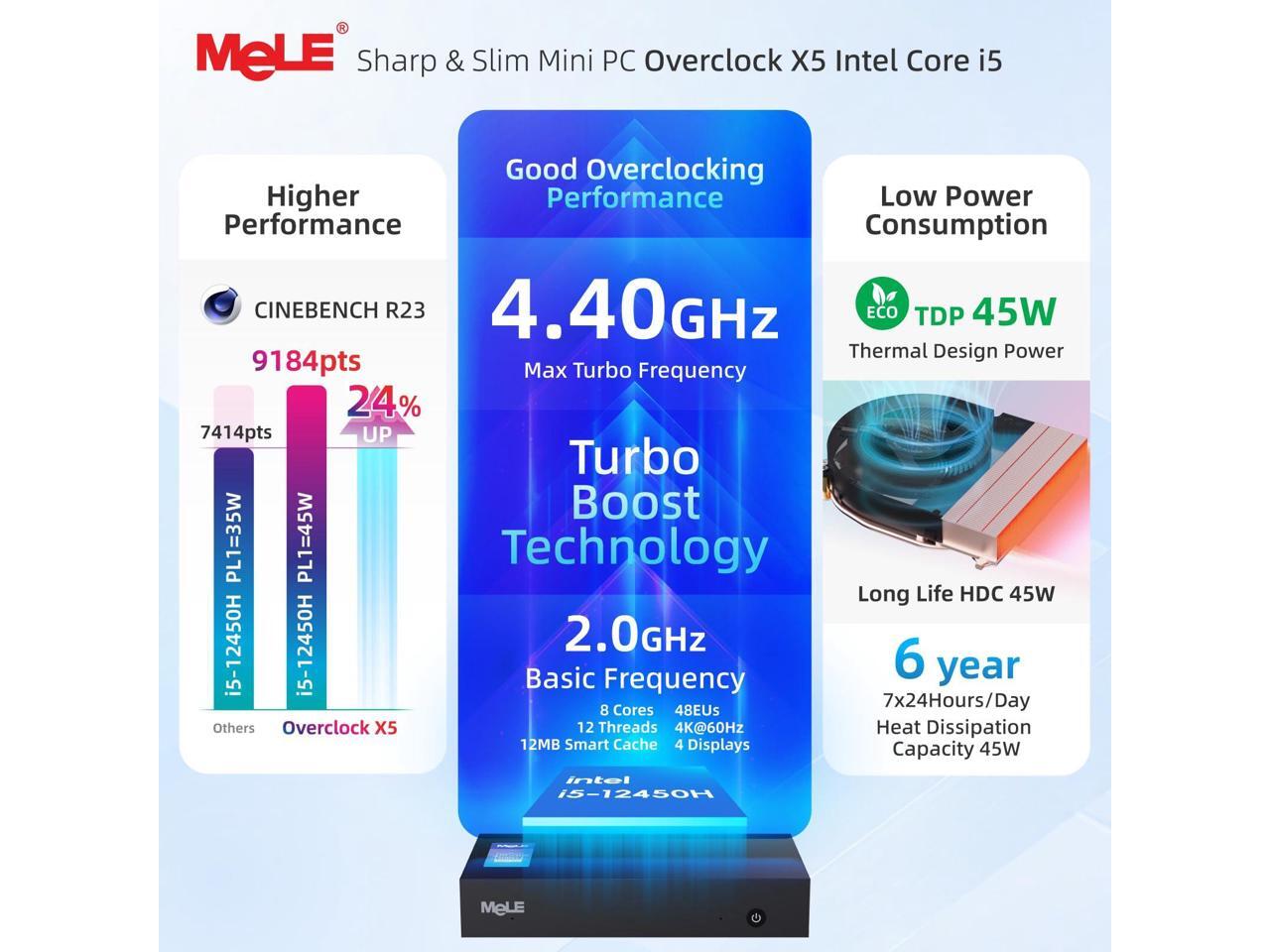 - Powerful 8-Core i5 Processor: MeLE Overclock X5 mini PC with Core i5-12450H processor, 8 cores, 12 threads, 12MB cache, 2.0GHz to 4.4 GHz, running much faster than i7-11375H, i7-1135G7 and AMD R7 5800H. Compared to other competitors with the same CPU, the TDP of OverclockX5 i5 mini pc is designed to be the highest value of 45W, maximizing CPU performance, having stronger data processing capabilities, running more smoothly. Compatible with Windows and Linux Ubuntu, Debian OS.