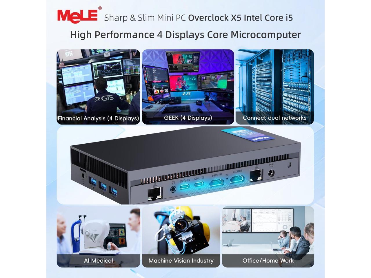 - Support 4K Quad Display: MeLE Overclock X5 i5 micro PC is built in 1.2GHz UHD Graphics, equipped with 2 full function USB Type-C ports and 2 HDMI 2.0 ports, which supports 4K 4 Screens Display simultaneously. The full functional USB-C interfaces support 4K display, data transmission (10Gbps) and Power input (with PD3.0 protocol), all in one cable. Ideal for multitasking office work (improve work efficiency), video conferencing, financial transactions, real-time monitoring, light creative work.