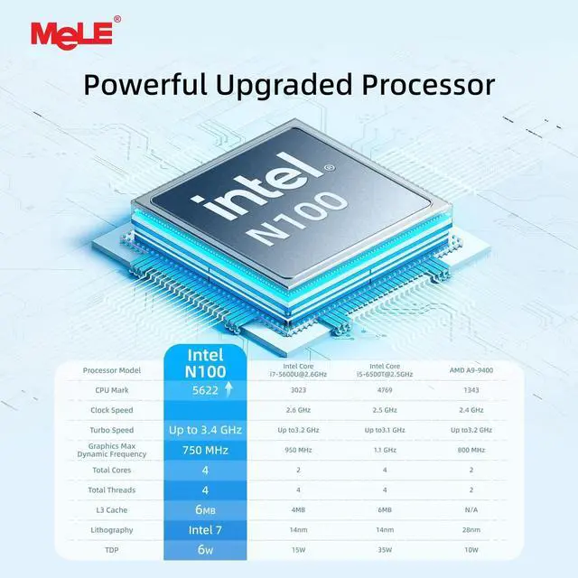 Newest Gen12th CPU-N100 MeLE Quieter4C adopts 2023 12th Gen Alder Lake N100 (Up to 3.4GH z, 6MB L3 Smart Cache) processor. Compared with i7-5600U/ i5-6500T, N100 CPU single core performance +85%; compared to N5105/N5095, N100 CPU performance +38%, more powerful performance and smoother running. Support Win11 and Linux Ubuntu, Debian, etc. ^^ Support 4K Triple Screen Display MeLE Quieter 4C mini computer supports 2x HDMI 2.0 + 1x USB Type-C (DP 1.4 ) 4K Triple display, supports 4K local video playback and 1080p online video playback due to its fanless and low power consumption design (TDP=8W).