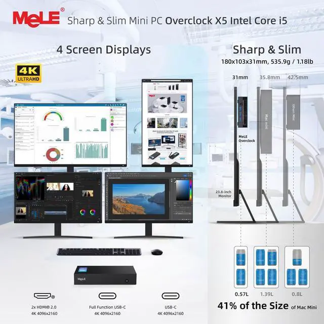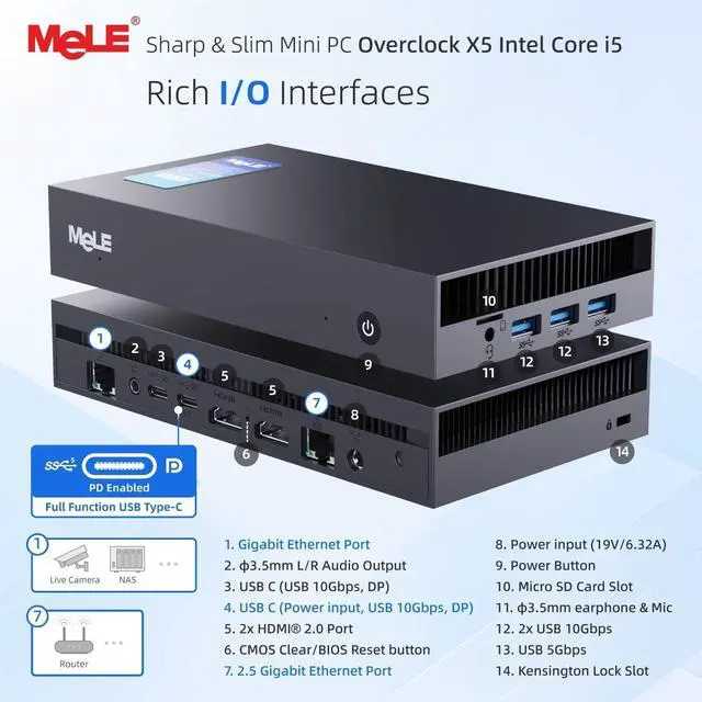 Quad Display: MeLE Overclock X5 i5 micro PC is built in 1.2GH z UHD Graphics, equipped with 2 full function USB Type-C ports and 2 HDMI 2.0 ports, which supports 4K 4 Screens Display simultaneously. The full functional USB-C interfaces support 4K display, data transmission (10Gbps) and Power input (with PD 3.0 protocol), all in one cable. Ideal for multitasking office work (improve work efficiency), video conferencing, financial transactions, real-time monitoring, light creative work. ^^ 2.5G bE + 1GbE Dual