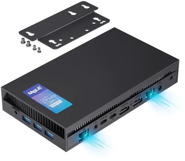 SSD Slots: 1x M. 2 2280 SATA SSD (600MB/s) + 1x M. 2 2280 NVMe SSD (PCIe 4.0 x4, 7876MB/s). For Overclock X5 512GB mini pc, you can add a SATA SSD in the SATA SSD slot or replace a larger storage NVMe SSD in the NVMe SSD slot. Two DDR slots, support dual channel, pre-installed 16GB 3200MHz DDR4 (SO-DIMM). You can replace with 64GB (32GB + 32GB) DDR at most. This small computer is only 7.09 * 4.06 * 1.22 in, 0.57L, 18.8 oz. ^^ Rich I/O Ports & Smart Features: MeLE Overclock X5 mini desktop PC is equipped with HDMI x 2, USB 10Gbps x 2, USB 5Gbps x 1, USB Type-C (DP 1.4 /USB 3.2 Gen2/PD 3.0 protocol )x 1, USB Type-C (DP 1.4 /USB 3.2 Gen2 )x 1, Micro SDXC reader x 1, 3.5 mm earphone x 1, 3.5 mm earphone & Mic x 1, 1GbE RJ-45 Jack x 1, 2.5G bE RJ-45 Jack x 1, M. 2 2280 SATA SSD slot x 1, M. 2 2280 NVMe SSD slot x