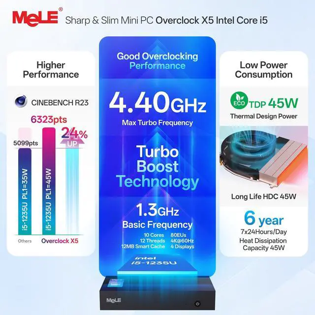 Processor: MeLE Overclock X5 mini PC with Core i5-1235U processor, 2 P-Core + 8 E-core, 12 threads, 12MB cache, 2.0GH z to 4.4 GHz, running much faster than i7-11375H, i7-1135G7 and AMD R7 5800H. Compared to other competitors with the same CPU, the TDP of OverclockX5 i5 mini pc is designed to be the highest value of 45W, maximizing CPU performance, having stronger data processing capabilities, running more smoothly. Compatible with Windows and Linux Ubuntu, Debian OS. ^^ Support 4K
