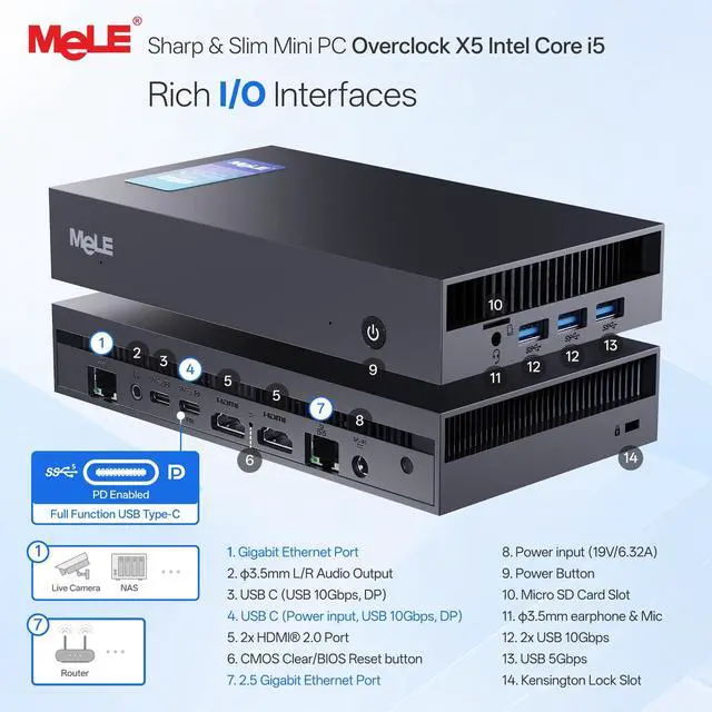 Quad Display: MeLE Overclock X5 i5 micro PC is built in 1.2GH z UHD Graphics, equipped with 2 full function USB Type-C ports and 2 HDMI 2.0 ports, which supports 4K 4 Screens Display simultaneously. The full functional USB-C interfaces support 4K display, data transmission (10Gbps) and Power input (with PD 3.0 protocol), all in one cable. Ideal for multitasking office work (improve work efficiency), video conferencing, financial transactions, real-time monitoring, light creative work. ^^ 2.5G bE + 1GbE Dual