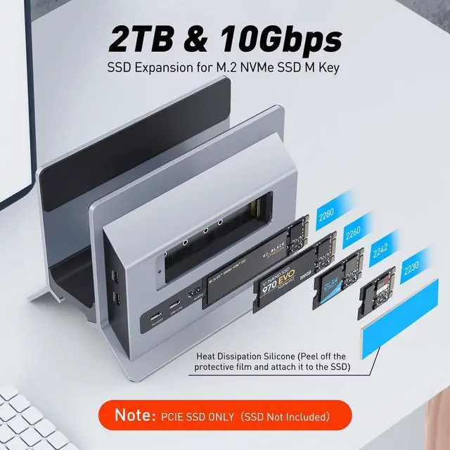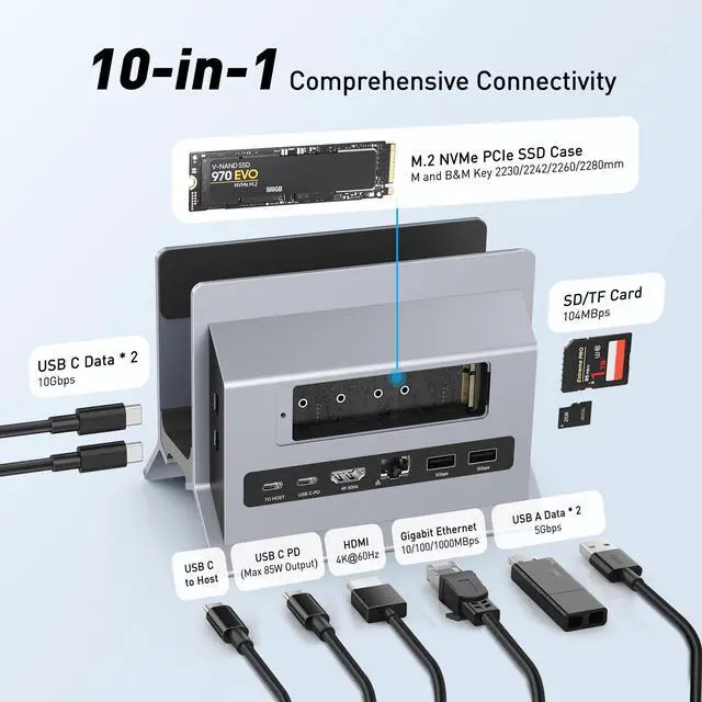 10-in-1 MacBook Docking Station: This versatile Laptop Docking Stations offers M.2 SSD Expansion, 1 x 4K HDMI, 1 x PD3.0, 2 x 10Gbps USB C, 2 x USB 3.0, 1 x Ethernet, 1 x SD/TF, making it an ideal laptop dock for enhanced connectivity and productivity.
